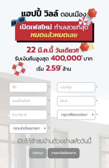 พบกับโปรโมชั่น Summer Hot Deal กับโครงการ "แฮปปี้ วิลล์ ดอนเมือง" ทาวน์โฮมทาวน์โฮม 3 ห้องนอน 2 ห้องน้ำ 2 ที่จอดรถ ดีไซน์ฟังก์ชั่นใหม่ จาก Infinite Real Estate ที่ได้มีการปรับแบบให้มีฟังก์ชันการใช้งานที่ลงตัวมากขึ้น พัฒนาจากความเห็นผู้พักอาศัยจริง เพื่อให้ได้ฟังก์ชั่นที่ลงตัวมากที่สุด พร้อมทำเลการเดินทางสะดวกสบาย ใกล้ทางด่วนศรีสมาน ใกล้สนามบินดอนเมือง เปิดเฟสสุดท้าย ทำเลสวยที่สุด พิเศษสุดรับเงินคืนสูงสุด 400,000 บาท* เฉพาะวันที่ 22 มีนาคม 2563 นี้ วันเดียวเท่านั้น ราคาเริ่ม 2.59 ล้านบาท*