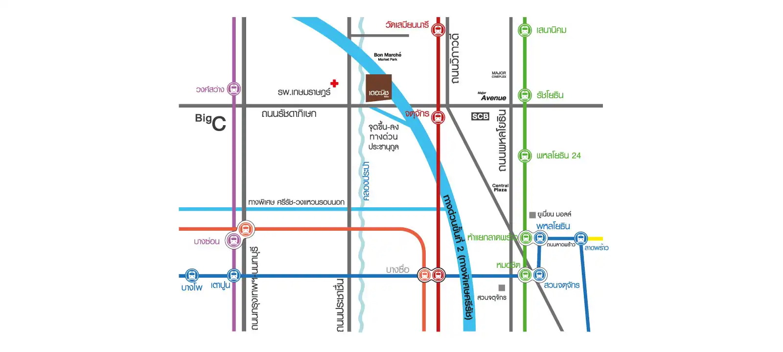 โครงการบนทำเลศักยภาพ ติดถนนรัชดาภิเษก ช่วงแยกประชานุกูล ตรงข้าม รพ.เกษมราษฎร์ เดินทางสะดวกสบาย เชื่อม 6 เส้นทางด่วน และ 8 เส้นรถไฟฟ้า รายล้อมด้วยแหล่งอำนวยความสะดวกครบครัน มี 7-Eleven ภายในโครงการ ใกล้ Major รัชโยธิน, Central Plaza ลาดพร้าว, Union Mall, ตลาดประชานิเวศน์, รร.หอวัง, ม.เกษตรศาสตร์, ม.ธุรกิจบัณฑิต, สวนสุขภาพประชานุกูล, กรมยุทธบริการทหาร และ อุทยานสวนจตุจักร