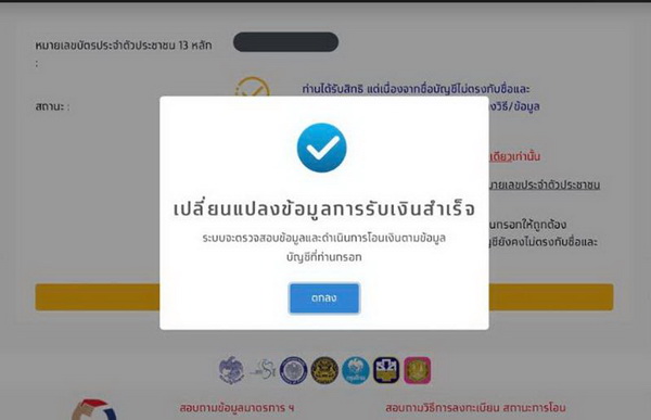 หากสำเร็จ จะขึ้นว่า "เปลี่ยนแปลงข้อมูลการรับเงินสำเร็จ ระบบจะตรวจสอบข้อมูลและดำเนินการโอนเงินตามข้อมูลบัญชีที่ท่านกรอก"