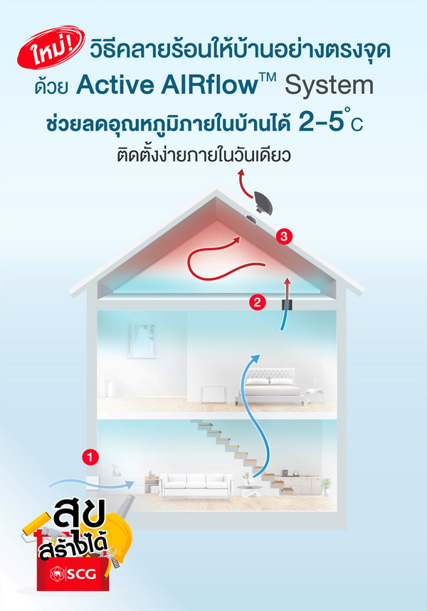 Active AIRflow™ System เดิมทีเจ้าของบ้านจะถ่ายเทอากาศและความร้อนภายในบ้านด้วยการเปิดหน้าต่างและประตูทิ้งไว้ แต่ปัญหาด้านมลภาวะและฝุ่น PM 2.5 ที่เพิ่มขึ้นมากขึ้นเรื่อยๆ ทำให้ความร้อน อากาศเสียและฝุ่นละอองขนาดเล็กเหล่านี้เข้ามาภายในตัวบ้านระหว่างที่เปิดประตูและหน้าต่าง หรือเล็ดลอดผ่านกรอบประตูหน้าต่าง รอยผนังที่ไม่มิดชิดได้อีกด้วย แต่เราสามารถเปลี่ยนบ้านให้อยู่สบายและลดฝุ่นได้ด้วยระบบ Active AIRflow™ System นวัตกรรมเร่งกลไกการถ่ายเทอากาศและระบายความร้อนออกจากตัวบ้าน และโถงหลังคา ซึ่งมีระบบการทำงาน 3 ขั้นตอน ได้แก่