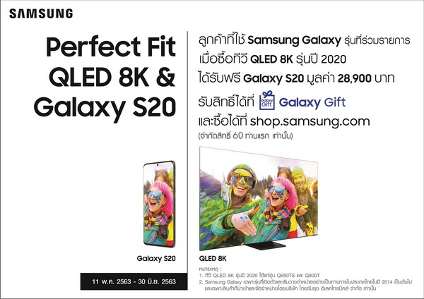 สัมผัสประสบการณ์ 8K ที่ชัดสมจริงทุกอณู "ซัมซุง ผู้นำด้านนวัตกรรมและเทคโนโลยีระดับโลก" ชวนสัมผัสความลงตัวที่สมบูรณ์แบบที่สุด ดื่มด่ำคอนเทนต์แบบสมจริงและยิ่งใหญ่กว่าเดิมบน QLED ความละเอียด 8K ของซัมซุง เมื่อซื้อ ซัมซุง QLED 8K ไลน์อัพปี 2020 รับฟรี Galaxy S20 สมาร์ทโฟนระดับพรีเมี่ยมที่จะมาปฎิวัติการถ่ายภาพและวีดีโอความละเอียดระดับ 8K