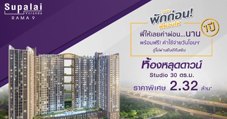 ศุภาลัย พักก่อน พี่ผ่อนให้ ห้องหลุดดาวน์ คอนโดพร้อมอยู่ ใกล้ MRT ศุภาลัย เวอเรนด้า พระราม 9 คอนโด High-Rise สูง 31 ชั้น จำนวน 1,410 ยูนิต ภายในมียูนิตร้านค้า 14 ยูนิต ขนาดยูนิตที่พักอาศัยเริ่มต้นที่ 30 - 112 ตร.ม. ตึกสูงวิวสวย เฟอร์นิเจอร์ครบ ติดถนนพระราม 9 ใกล้จุดขึ้น-ลงทางด่วนศรีรัชพร้อมอยู่ ใกล้ MRT รฟม.โปรโมชั่นพิเศษพิเศษ! จองวันนี้ อยู่ฟรี 1 ปีฟรี! ค่าใช้จ่ายวันโอนฯห้องหลุดดาวน์ ราคาพิเศษ 2.32 ล้านบาท*