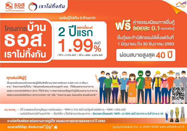 “อัตราดอกเบี้ยที่อยู่ในระดับต่ำในปัจจุบัน ถือเป็นโอกาสดีสำหรับคนที่ต้องการมีบ้านเป็นอย่างมาก ธอส. จึงได้กำหนดอัตราดอกเบี้ยเพียง 1.99% ต่อปี ถือเป็นการแบ่งเบาภาระในการผ่อนชำระของลูกค้าโดยตรง อาทิ กรณีกู้ 1 ล้านบาท จะผ่อนชำระ 2 ปีแรกเพียง 3,300 บาทต่อเดือนเท่านั้น นอกจากนี้ เพื่อให้ประชาชนได้รับวงเงินกู้สูงขึ้นเพื่อเพิ่มโอกาสในการได้มีบ้าน ธอส. จึงกำหนดสัดส่วนความสามารถชำระหนี้ต่อรายได้ (Debt Service Ratio หรือ DSR) ในกรณีลูกค้ารายย่อยเพิ่มเป็นสูงสุดไม่เกิน 50% ของรายได้สุทธิต่อเดือน โดยถือเป็นโครงการที่ครอบคลุมทั้งคนในครอบครัวของผู้ที่ได้รับเงินเยียวยา 5,000 บาท ที่ปัจจุบันมีผู้ผ่านเกณฑ์จำนวนกว่า 15 ล้านราย และครอบครัวของลูกค้า ธอส. ที่ลงทะเบียนเข้ามาตรการช่วยเหลือจากปัญหาโควิด-19 มากกว่า 4 แสนราย จึงเชื่อว่าโครงการบ้าน ธอส. คนไทยไม่ทิ้งกัน จะสนับสนุนให้ภาคอสังหาริมทรัพย์และเศรษฐกิจไทยฟื้นตัวได้ เร็วขึ้น” นายกมลภพ กล่าว