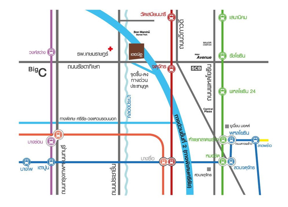 โครงการบนทำเลศักยภาพ ติดถนนรัชดาภิเษก ช่วงแยกประชานุกูล ตรงข้าม รพ.เกษมราษฎร์ เดินทางสะดวกสบาย เชื่อม 6 เส้นทางด่วน และ 8 เส้นรถไฟฟ้า รายล้อมด้วยแหล่งอำนวยความสะดวกครบครัน มี 7-Eleven ภายในโครงการ ใกล้ Major รัชโยธิน, Central Plaza ลาดพร้าว, Union Mall, ตลาดประชานิเวศน์, รร.หอวัง, ม.เกษตรศาสตร์, ม.ธุรกิจบัณฑิต, สวนสุขภาพประชานุกูล, กรมยุทธบริการทหาร และ อุทยานสวนจตุจักร