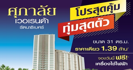 โปรสุดคุ้ม ทุ่มสุดตัว คอนโด ใกล้รถไฟฟ้า ขนาด 31 ตร.ม. จองรับเครื่องใช้ไฟฟ้า ศุภาลัย เวอเรนด้า รัตนาธิเบศร์ ความสุขที่ครบครัน ของชีวิตที่ทันสมัย ติดถนนใหญ่ ใกล้รถไฟฟ้า MRT ศรีพรสวรรค์ 380 เมตร ใกล้เซ็นทรัล รัตนาธิเบศร์ ใกล้ทางด่วนโปรโมชั่นพิเศษจองวันนี้รับเครื่องใช้ไฟฟ้าไปเลยจุกๆ 5 ชิ้น* ขนาดห้อง 31 ตร.ม.ราคาเดียว 1.39 ล้านบาท*