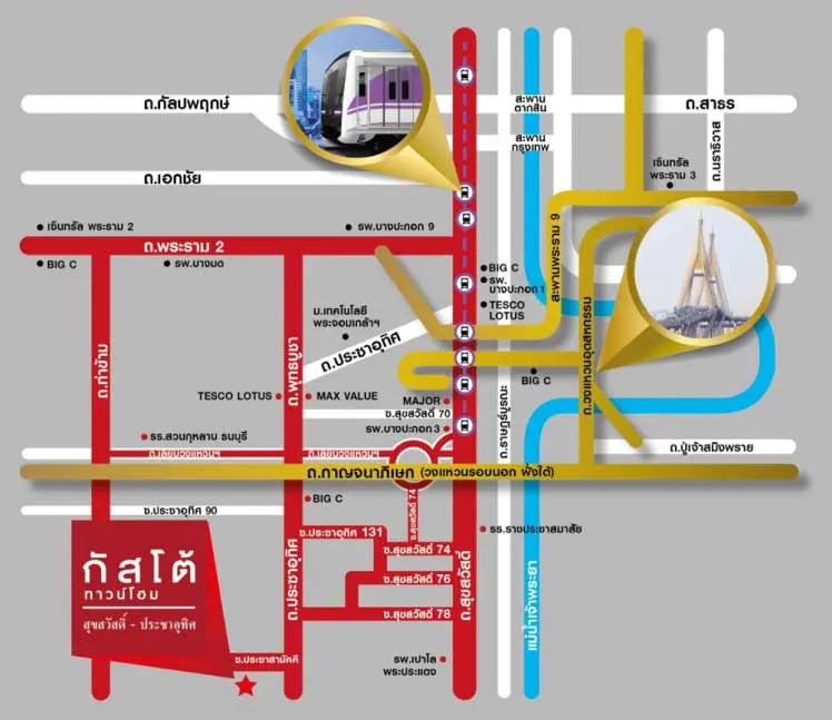 "กัสโต้ สุขสวัสดิ์-ประชาอุทิศ" พรีเมียมทาวน์โฮมสไตล์อังกฤษ บนทำเลสุขสวัสดิ์-ประชาอุทิศ ใกล้ถนนวงแหวนอุตสาหกรรม ประมาณ 6.8 กม. ใกล้รถไฟฟ้าสายสีม่วงใต้ สถานีครุใน ประมาณ 7.5 กม. (โครงการในอนาคต) ใกล้สะพานภูมิพล ประมาณ 10 กม. ใกล้ทางด่วนเฉลิมมหานคร ประมาณ 12.1 กม. พร้อมสิ่งอำนวยความสะดวกภายในโครงการครบครัน