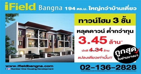 ทาวน์โฮม 3 ชั้น ถูกสุดในย่านบางนา "ไอฟีล บางนา" บ้านหลุดดาวน์ ต่ำกว่าทุน ทาวน์โฮม 3 ชั้น ใหญ่กว่าบ้านเดี่ยว 194 ตร.ม. บนทำเลศักยภาพ ใกล้ทางด่วนวงแหวนตะวันออก และสนามบินสุวรรณภูมิ รายล้อมด้วยสิ่งอำนวยความสะดวกมากมาย