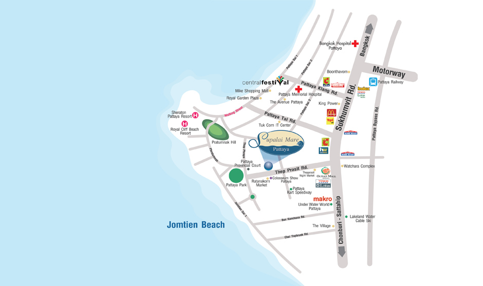 ตั้งอยู่ใจกลางพัทยา ริมถนนเทพประสิทธิ์ ห่างจากถนนสุขุมวิทเพียง 2 กม. แวดล้อมด้วยแหล่งช็อปปิ้งและสถานที่ท่องเที่ยวสำคัญ เช่น Outlet Mall, Tesco Lotus, Big C, เทพประสิทธิ์ ไนท์มาร์เก็ด,