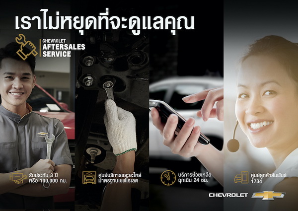 ทั้งนี้ลูกค้าที่ซื้อรถเชฟโรเลตยังคงได้รับบริการหลังการขายและศูนย์บริการลูกค้าสัมพันธ์เพื่อคอยดูแลและให้บริการลูกค้าอยู่เช่นเดิม ทั้งรับประกัน 3 ปี หรือ 100,000 กิโลเมตร ครอบคลุมค่าแรงช่างซ่อม อะไหล่แท้มาตรฐานเชฟโรเลต และการรับประกันคุณภาพรถยนต์ ,ศูนย์บริการและอะไหล่แท้มาตรฐานเชฟโรเลต,บริการช่วยเหลือฉุกเฉิน 24 ชั่วโมง และศูนย์ลูกค้าสัมพันธ์ 1734 ตั้งแต่ 7:00 – 20:00 น.ด้วย