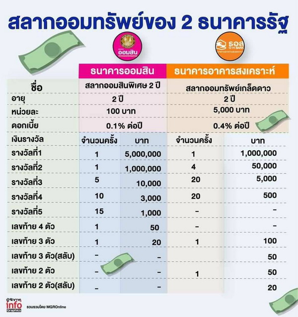 แบงก์รัฐลงสนามชิงเงินออมผ่านสลากออมทรัพย์ 2 ปี ธอส.ออกชุดเกล็ดดาว ชูจุดเด่นเลขท้ายเต็ง-โต๊ด ให้ดอกเบี้ย 0.4% แต่หน่วยละ 5 พันบาท เจ้าตลาดเดิมอย่างแบงก์ออมสิน หน่วยละ 100 บาท ดอกเบี้ย 0.1% เปรียบมวยเงินรางวัลออมสินให้มากกว่าแต่มีเงื่อนไขส่วน ธอส.แม้น้อยกว่าแต่ให้หมวดต่อหมวด นักการเงินแนะกระจายเงินรางวัล เพิ่มโอกาสถูกรางวัล