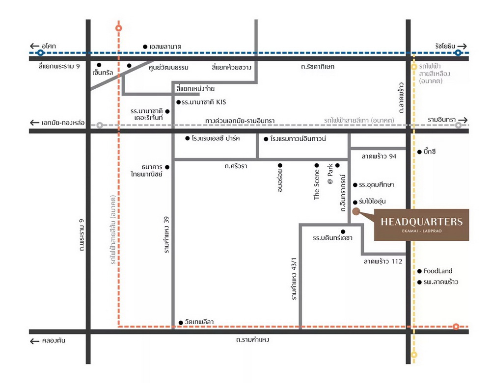 เฮดควอเทอร์ส เอกมัย-ลาดพร้าว บรรยากาศการทำงานแห่งใหม่ ในทำเลที่ทุกคนคุ้นเคย -เดินทางเข้าออกได้หลายทาง ใกล้ จุดขึ้นลงทางด่วน เอกมัย-รามอินทรา, ถ.รามคำแหง, ถ.ลาดพร้าว และแนวรถไฟฟ้าสายสีเหลือง (โครงการในอนาคต), สี่แยกห้วยขวาง,MRT ลาดพร้าว และ สี่แยกพระราม9 -แวดล้อมด้วยห้างสรรพสินค้า อาทิ @PARK, The Scene, ต้นซุง อเวนิว, BIG C ลาดพร้าว, CENTRAL EASTVILLE, THE CRYSTAL และ CDC -ใกล้สถานศึกษา อาทิ โรงเรียนอุดมศึกษา, โรงเรียนบดินทร์เดชา, ม.รามคำแหง, โรงเรียนนานาชาติเดอะรีเจ้นท์, โรงเรียนนานาชาติ KIS และ ม.อัสสัมชัญ (ABAC) -ใกล้สถานพยาบาล อาทิ โรงพยาบาลลาดพร้าว และ โรงพยาบาลพระราม9 -ใกล้โรงแรม TOWN IN TOWN และ โรงแรม SC PARK