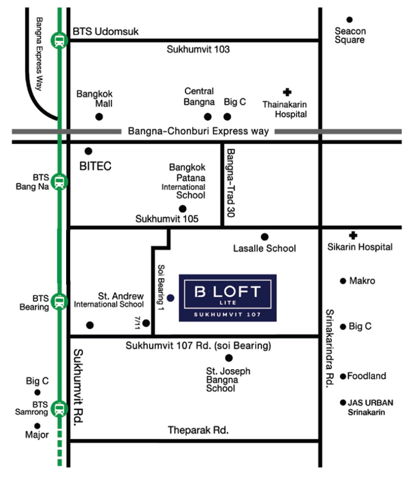 โครงการ บี ลอฟท์ สุขุมวิท 107 ตั้งอยู่ในซอยแบริ่ง 1 ต.สำโรงเหนือ อ.เมือง จ.สมุทรปราการ เดินทางสะดวกใกล้ BTS แบริ่ง และ ถนนสุขุมวิท ประมาณ 850 เมตร รายล้อมด้วยสิ่งอำนวยความสะดวกครบครัน
