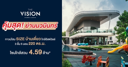 "เดอะ วิชั่น ลาดพร้าว - นวมินทร์" ทาวน์โฮมดีไซน์ใหม่ ใหญ่ทุกห้องนอน ทำเลทองย่านลาดพร้าว - นวมินทร์ เทียบเท่าบ้านเดี่ยว กว้างสุด 220 ตร.ม. 5 ห้องนอน 4 ห้องน้ำ ฟังก์ชั่นครบ วิวสวนหน้าคลับเฮาส์ พื้นที่มากขึ้น... ความสุขมากขึ้น ใกล้ทางด่วนรามอินทรา-อาจณรงค์ และกาญจนาภิเษก ใกล้รถไฟฟ้าถึง 4 สาย