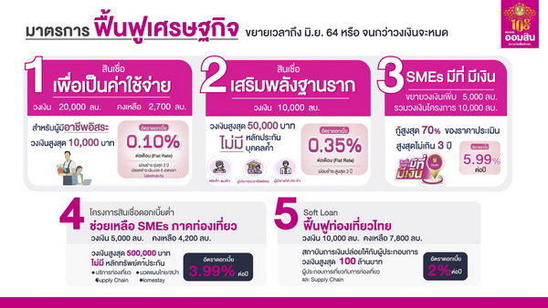 วงเงิน 5,000 ล้านบาท คงเหลือ 4,200 ล้านบาท วงเงินสูงสุด 500,000 บาท ไม่มีหลักทรัพย์ค้ำประกัน อัตราดอกเบี้ย 3.99% สำหรับกลุ่มท่องเที่ยว, นวดสปาแผนไทย, Supply Chain และ Homestay