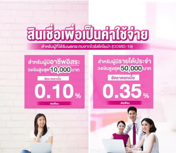 สำหรับผู้มีอาชีพอิสระที่ได้รับผลกระทบจากไวรัสโคโรนาโควิด-19 หรือ สินเชื่อฉุกเฉิน วงเงินสูงสุด 10,000 บาท ดอกเบี้ยคงที่ 0.10% ต่อเดือน ผ่อนชำระสูงสุด 24 เดือน หรือ 2 ปี ไม่ต้องชำระเงินกู้ 6 งวดแรก
