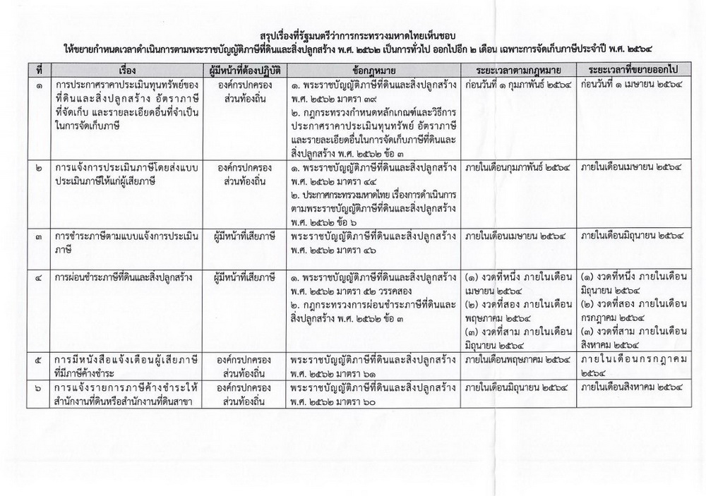 มท. สั่ง อปท. ขยายเวลาเก็บภาษีที่ดิน 64 รัฐมนตรีว่าการกระทรวงมหาดไทย เห็นชอบให้ขยายกําหนดเวลาดําเนินการตามพระราชบัญญัติภาษีที่ดินและสิ่งปลูกสร้าง พ.ศ. 2562 เป็นการทั่วไป ออกไปอีก 2 เดือน เฉพาะการจัดเก็บภาษีประจําปี พ.ศ. 2564