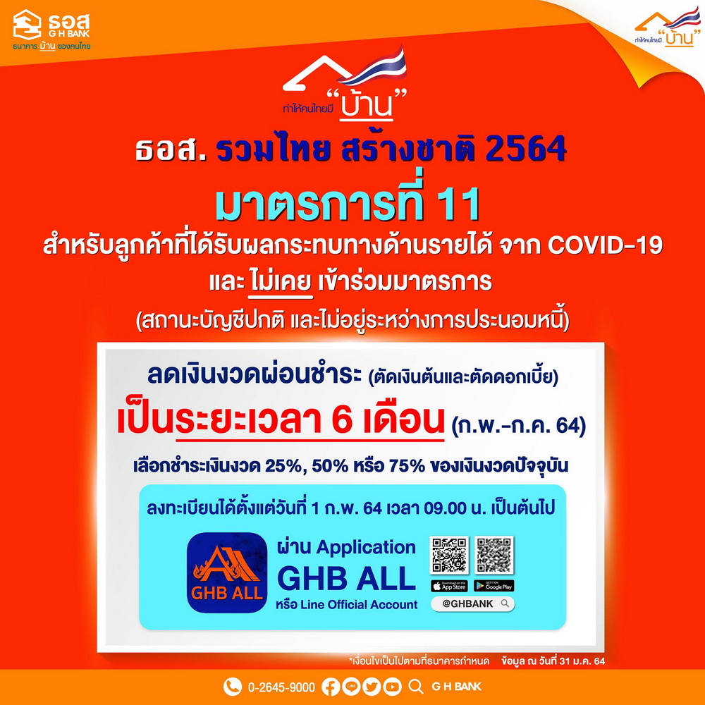 เริ่มแล้ววันนี้ ธอส. เปิดลงทะเบียน มาตรการช่วยเหลือลูกค้า เนื่องจากผลกระทบโควิด-19 ระลอกใหม่ ลดเงินงวดผ่อนชำระ ตัดเงินต้นและดอกเบี้ย เป็นระยะเวลา 6 เดืิอน