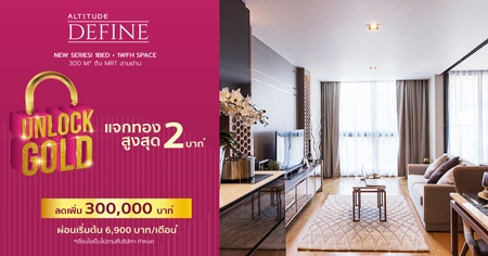 UNLOCK GOLD คอนโด Modern Luxury ใจกลางกรุง แจกทองสูงสุด 2 บาท อัลติจูด ดีไฟน์ ลักซ์ชัวรี่คอนโดมิเนียมใจกลางกรุง เติมเต็มชีวิตครบทุกฟังก์ชั่น ตกแต่งสไตล์ Modern Luxury ด้วยดีเทลรายละเอียดเพื่อคุณ เพียง 3 นาทีจากจุฬาฯ 300m. จาก MRTสามย่าน เป็นส่วนตัวที่สุดในย่านใจกลางเมือง เพียง 59 ยูนิตโปรโมชั่นพิเศษส่วนลดสูงสุด 300,000 บาท*แจกทองสูงสุด 2 บาท*เริ่มเพียง 5.59-6.99 ล้านบาท*
