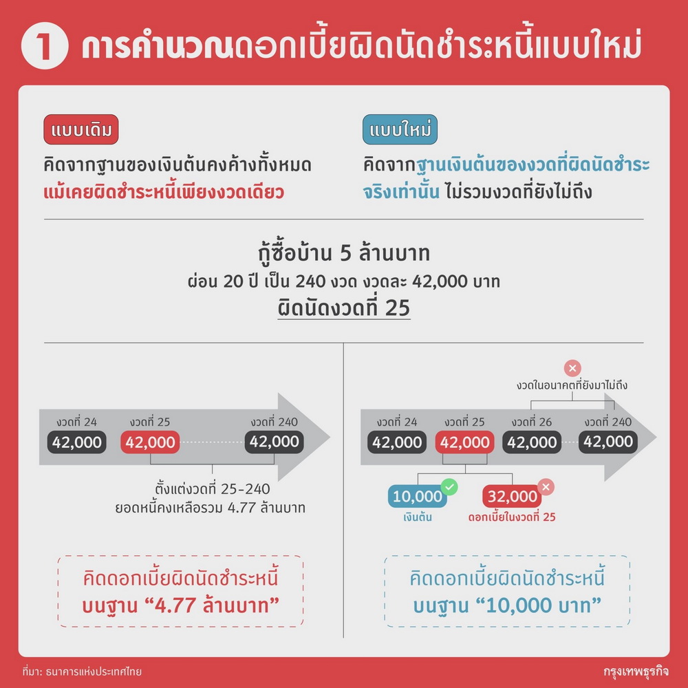 การคิดดอกเบี้ยผิดนัดชำระหนี้แบบใหม่ จะไม่ให้รวมส่วนของ "เงินต้นของค่างวดในอนาคตที่ยังไม่ถึงกำหนดชำระ" ซึ่งต่างจากแบบเดิมที่หากผิดนัดชำระหนี้เพียงงวดเดียว ผู้ให้บริการทางการเงินสามารถคิดดอกเบี้ยผิดนัดชำระหนี้จากฐานเงินต้นคงค้างทั้งหมด ซึ่งเป็นสาเหตุที่ทำให้มูลค่าดอกเบี้ยผิดนัดสูงมาก ซึ่งเกณฑ์ใหม่นี้จะทำให้การคิดดอกเบี้ยผิดนัดชำระหนี้สอดคล้องกับข้อเท็จจริง และเกิดความเป็นธรรมกับประชาชนมากขึ้น