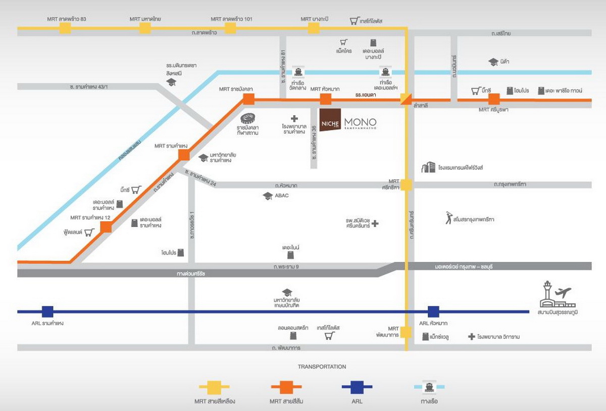 โครงการบนถนนรามคำแหง ฝั่งขาเข้า ติดรถไฟฟ้า MRT สถานีหัวหมาก 0 เมตร เชื่อมต่อรถไฟฟ้าสายสีเหลือง ได้ง่าย เพียง 1 สถานี สะดวกทุกเส้นทางการเดินทาง ไม่ว่าจะเป็น ถนนรามคำแหง, หัวหมาก, บางกะปิ, ศรีนครินทร์, กรุงเทพกรีฑาตัดใหม่, พระราม 9 และ มอเตอร์เวย์ ใกล้ท่าเรือวัดกลาง เชื่อม Airport Link รามคำแหงได้ง่าย รายล้อมด้วยสถานที่สำคัญ ทั้งห้างสรรพสินค้า, สถานศึกษา และ โรงพยาบาลครบถ้วน