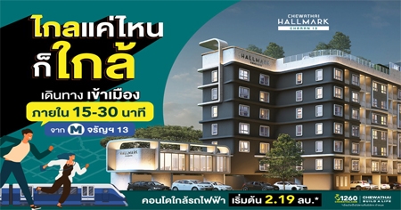 คอนโดแต่งครบพร้อมอยู่ ใกล้รถไฟฟ้า จรัญฯ 13 "ชีวาทัย ฮอลล์มาร์ค จรัญ 13" คอนโดโลว์ไรส์ 8 ชั้น แต่งครบพร้อมเข้าอยู่ สิ่งอำนวยความสะดวกครบครัน บนทำเลใกล้รถไฟฟ้า MRT จรัญฯ 13 เพียง 400 เมตร ไม่ว่าที่ไหนก็ใกล้ เข้าเมืองได้ภายใน 30 นาที