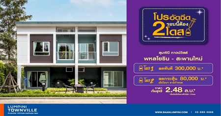 โปรอัดฉีด รอบนี้ต้อง 2 โดส ทาวน์โฮม ใกล้รถไฟฟ้าสายสีเขียว "ลุมพินี ทาวน์วิลล์ พหลโยธิน - สะพานใหม่" ทาวน์โฮม 2 ชั้น 2 รูปแบบ 2-3 ห้องนอน 3 ห้องน้ำ 1-2 ห้องอเนกประสงค์ ที่สามารถปรับใช้เป็นห้องนอนผู้สูงอายุหรือห้องทำงานได้สบายๆ ส่วนกลางครบครัน ทำเลแห่งอนาคต ใกล้สนามบินดอนเมือง ใกล้รถไฟฟ้า BTS สายสีเขียว (ส่วนต่อขยายหมอชิต-สะพานใหม่-คูคต) และรถไฟชานเมือง สายสีแดง (บางซื่อ-รังสิต)