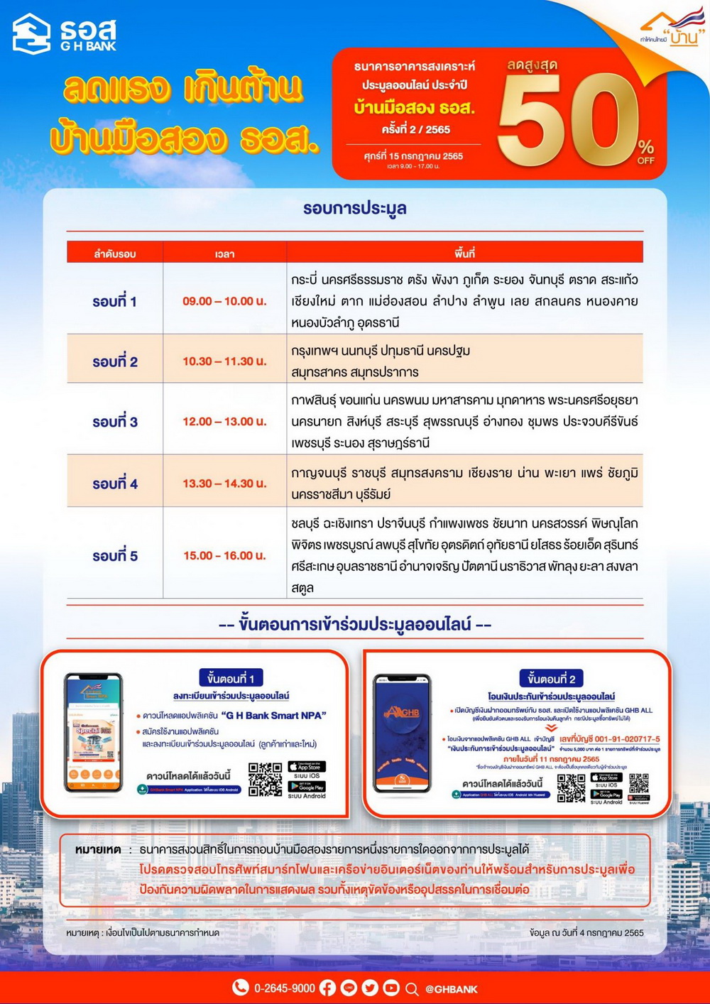 สำหรับผู้ที่สนใจสามารถดาวน์โหลด Application : G H Bank Smart NPA เพื่อลงทะเบียนเข้าร่วมประมูลแบบออนไลน์ (เฉพาะลูกค้าที่ยังไม่เคยลงทะเบียน) และวางเงินประกันการประมูล 5,000 บาท ภายในวันที่ 11 กรกฎาคม 2565 ซึ่งการประมูลจะแบ่งออกเป็น 5 รอบ รอบละ 60 นาที ดูรายละเอียดรอบการประมูลได้บนเว็บไซต์ www.ghbhomecenter.com ส่วนผู้ชนะการประมูลจะได้รับ QR Code สำหรับติดต่อกับธนาคารเพื่อชำระเงินและทำสัญญาตามที่ธนาคารกำหนด