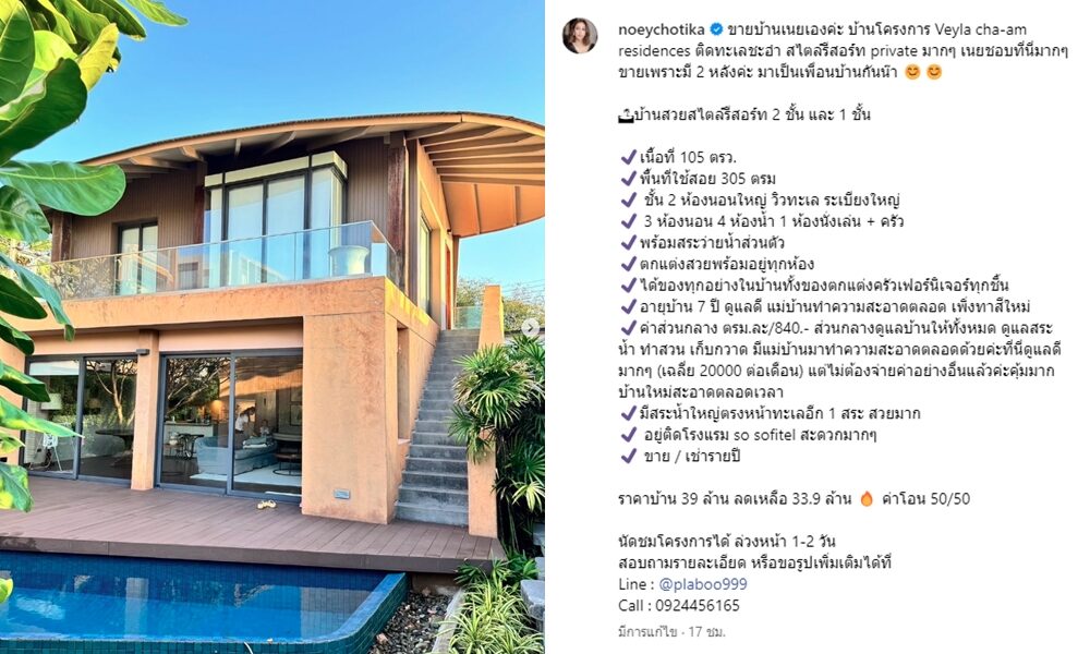เนย โชติกา ประกาศขายบ้านหรู 2 ชั้น และ 1 ชั้น ทำเลติดทะเลชะอำ พร้อมขายในราคาสุดพิเศษ 33.9 ล้าน เนื้อที่ 105 ตร.ว. ทำการตกแต่งพร้อมอยู่ มีเฟอร์ครบทุกชิ้น พร้อมบอกถึงเหตุผลที่ขาย คนแห่เมนต์บ้านสวยมาก หลัง เนย โชติกา โพสต์อินตราแกรม noeychotika ประกาศ ขายบ้านหรูหลังงาม ติดทะเลชะอำ พร้อมลงคลิปโชว์วิวทะเล บรรยากาศร่มรื่น เนื้อที่กว่า 105 ตร.ว. ตกแต่งสวยพร้อมอยู่ ได้ของทุกอย่างในบ้าน ทั้งของตกแต่งครัวเฟอร์นิเจอร์ทุกชิ้น ราคาพิเศษจาก 39 ล้านบาท ลดเหลือ 33.9 ล้านบาท