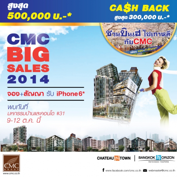 CMC BIG SALES 2014 โดยบริษัทพระยาพาณิชย์พร็อพเพอร์ตี้จำกัดอีกหนึ่งบริษัทในเครือบริษัทเจ้าพระยามหานครจำกัด (มหาชน) หรือ CMC Group ทั้งนี้เพื่อเป็นการตอบแทนลูกค้าด้วยการรวบรวม 10 โครงการหรูบนทำเลคุณภาพอาทิชาโตว์อินทาวน์พระราม 8, ชาโตว์อินทาวน์สุขุมวิท 64 Skymoon, ชาโตว์อินทาวน์วิภาวดี 10, ชาโตว์อินทาวน์สุขุมวิท 62/1,ชาโตว์อินทาวน์สุขุมวิท 62/1 เฟส 2, ชาโตว์อินทาวน์รัชดา 10, ชาโตว์อินทาวน์รัชดา 20 เฟส 2, ชาโตว์อินทาวน์พหลโยธิน 32, ชาโตว์อินทาวน์เมเจอร์รัชโยธิน 2, แบงค์คอกฮอไรซอนรัชดา-ท่าพระและทั้งหมดนี้พร้อมให้คุณได้สัมผัสและเป็นเจ้าของแล้ววันนี้ 9-12 ต.ค. นี้ ณ ศูนย์ประชุมแห่งชาติสิริกิติ์บูธโซน G61-G69 แล้วพบกัน...