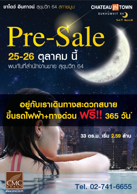ชาโตว์ อินทาวน์ สุขุมวิท 64สกายมูน คอนโดใหม่บนทำเลศักยภาพ สะดวกสบายทุกการเดินทาง ทั้ง BTS ปุณณวิถี และจุดขึ้น-ลงทางด่วนสุขุมวิท 62 พร้อมทั้งให้คุณดื่มด่ำกับบรรยากาศสระว่ายน้ำใต้แสงจันทร์บนชั้นดาดฟ้า 25-26 ตุลาคม นี้ ขนาด 33 ตร.ม. เริ่ม 2.59 ล้าน PRE-SALE "อยู่กับเราเดินทางสะดวกสบาย ขึ้นรถไฟฟ้า + ทางด่วน ฟรี!!365 วัน" โทร.02-741-6655