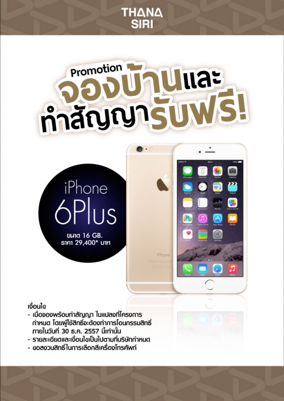 โค้งสุดท้ายปลายปี เบิร์ท - สุทธิรักษ์ เสถียรภาพอยุทธ์ เอ็มดีธนาสิริ ตอบรับกระแสคนอยากมีบ้านพร้อมอยู่ บนทำเลที่มีศักยภาพสูงสุดของโซนกรุงเทพฯ ตะวันตก ราชพฤกษ์ บางใหญ่ 5 โครงการคุณภาพมาจัดโปรโมชั่นพิเศษ เพียงแค่จองพร้อมทำสัญญา ในแปลงที่โครงการกำหนด รับฟรีทันที "IPhone 6 Plus" 16 GB. มูลค่า 29,400 บาท