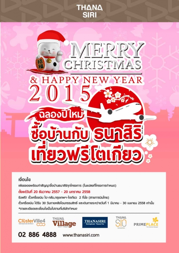 บมจ.ธนาสิริ กรุ๊ป มอบของขวัญปีใหม่ ให้กับลูกค้าที่ซื้อบ้านคุณภาพ 5 โครงการพร้อมอยู่ในเครือทั้งบ้านเดี่ยว บ้านแฝด ทาวน์โฮม และ บ้านรูปแบบใหม่ ด้วยประสบการณ์สุดประทับใจ ให้บินเที่ยวญี่ปุ่นฟรี กับตั๋วเครื่องบินกรุงเทพฯ-โตเกียว (สายการบินไทย) 2 ที่นั่ง มูลค่ากว่า 50,000 บาท เพียงจองและโอนกรรมสิทธิ์ ภายในวันที่ 20 มกราคม 2558 รีบด่วน!! จำนวนจำกัด