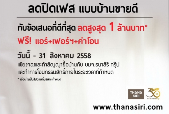 ธนาสิริ กรุ๊ป นำบ้านคุณภาพ 6 โครงการในเครือ มาจัดโปรโมชั่นพิเศษ พบแบบบ้านขายดีกับลดสูงสุดถึง 1 ล้านบาท แถมฟรี! บัตรกำนัล SB เฟอร์นิเจอร์+แอร์(ห้องนอนใหญ่)+ค่าโอนกรรมสิทธิ์ (ทุกแปลง) และ Samsung GX s6 edge (ในแปลงที่กำหนด) จัดแคมเปญพิเศษตลอดเดือนของแม่ ลดปิดเฟส กับข้อเสนอที่ดีที่สุด!
