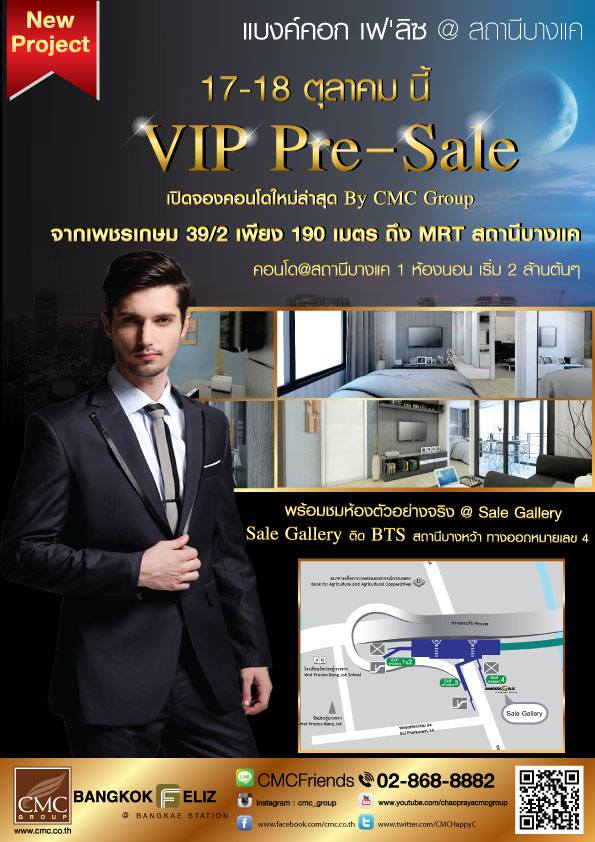 บริษัท เจ้าพระยามหานคร จำกัด (มหาชน) หรือ CMC Group ฉลองจัดงาน "VIP Pre-Sale" ภายใต้คอนเซ็ปต์ "Sky Blue" คอนโดมิเนียมน้องใหม่ ที่มีเอกลักษณ์เฉพาะตัว ด้วยวิวสระว่ายน้ำ Panorama 180 องศา สามารถว่ายน้ำชมแสงจันทร์ยามค่ำคืนตามคอนเซ็ปต์ "Sky Blue" ล้อมรอบไปด้วยสวนพักผ่อนขนาดใหญ่บนชั้นด้านฟ้า อีกทั้งเอาใจคนชอบช้อปด้วยห้างสรรพสินค้าชั้นนำ โดดเด่นบนทำเลศักยภาพที่เชื่อมต่อทุกการเดินทาง ใกล้สถานีรถไฟฟ้าบางแค เพียง 190 เมตร แบงค์คอก เฟ"ลิซ @ สถานีบางแค (Sky Blue) 1 ห้องนอน เริ่มต้นเพียง 2 ล้านต้นๆ
