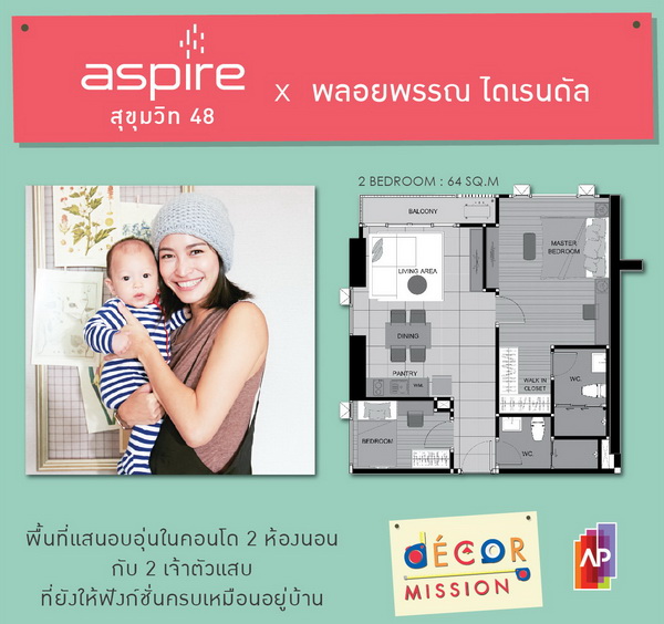 Aspire สุขุมวิท48 ได้ คุณพลอย พลอยพรรณ ไดเรนดัล ตัวแทนคุณแม่ยุคใหม่ ที่ทำงานหนักแต่ก็ยังต้องการมีเวลาให้กับลูกๆได้อย่างเต็มที่โดยได้ปรับฟังก์ชั่นคอนโด2 ห้องนอนให้เป็นเหมือนบ้านเพื่อรองรับกิจกรรมของครอบครัวและดูแลลูกน้อยสองคนได้อย่างใกล้ชิดถ่ายทอดความอบอุ่นของครอบครัวบนพื้นที่คอนโดพร้อมทั้งยังสามารถใช้เวลาส่วนตัวไปกับแฟซิลิตี้ส์ครบครัน