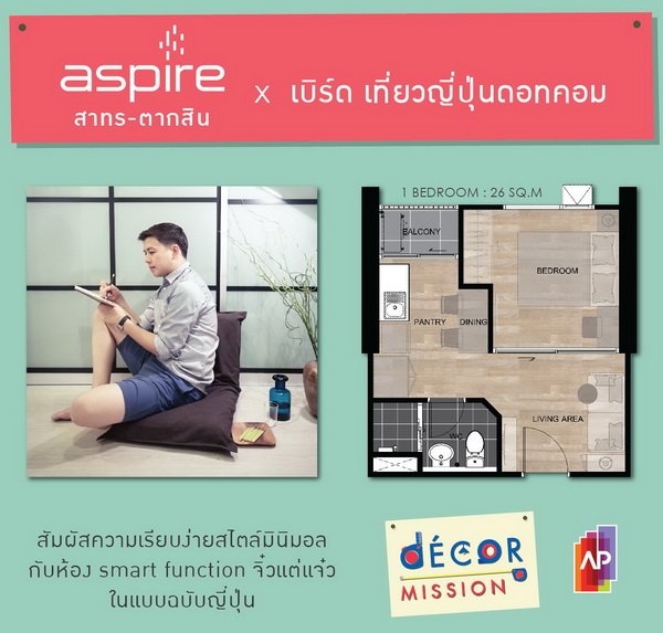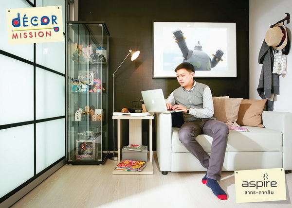 Aspire สาทร-ตากสิน ได้ คุณเบิร์ด ปริญญา เจ้าของเว็บไซต์และแฟนเพจเที่ยวญี่ปุ่นดอทคอม ตัวแทนหนุ่มนักคิดนักเขียน ที่ชื่นชอบความเป็นญี่ปุ่น ห้องจึงถูกออกแบบในสไตล์ Minimalist เน้นความเป็น smart function จิ๋วแต่แจ๋วในแบบฉบับญี่ปุ่น แม้ต้องเดินทางบ่อยด้วยอาชีพประจำเป็นสจ๊วตสายการบินแต่ก็อุ่นใจด้วยระบบรักษาความปลอดภัยของคอนโด