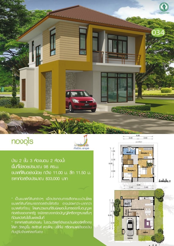 แบบบ้าน 2 ชั้น 3 ห้องนอน 2 ห้องน้ำ พื้นที่ใช้สอยประมาณ 98 ตร.ม. ขนาดที่ดินอย่างน้อย กว้าง 11 ม. ลึก 11.5 ม.