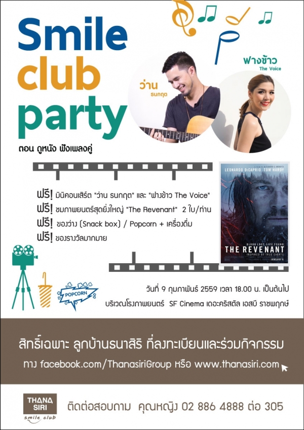 บริษัท ธนาสิริ กรุ๊ป จำกัด(มหาชน) ขอเชิญชวนลูกบ้านในโครงการของธนาสิริ ทุกโครงการ เข้าร่วมสนุกกับกิจกรรมธนาสิริ สมายล์ คลับ ภายใต้ธีมLucky Valentine ชมฟรีมินิคอนเสิร์ต "ว่าน ธนกฤต" และ "ฟางข้าว The Voice"และชมภาพยนตร์ "The Revenant" พร้อมรับของที่ระลึกมากมายภายในงาน ณ เดอะคริสตัล เอสบี ราชพฤกษ์ วันที่ 9 กุมภาพันธ์ 2559 เริ่มลงทะเบียนตั้งแต่เวลา 17.30 น.