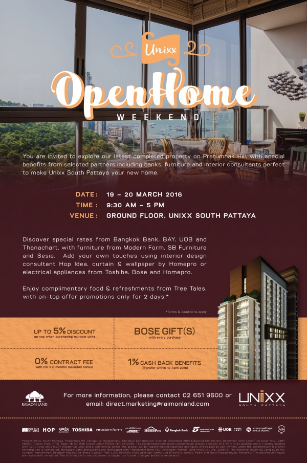 ไรมอน แลนด์ เปิดงาน Open Home Weekend ที่โครงการยูนิกซ์ เซาท์พัทยา (UNIXX South Pattaya) คอนโดมิเนียมสุดหรูบนหาดจอมเทียนด้วยทำเลทองแบบฟรีโฮลด์ ราคาเริ่มต้นที่ 2 ล้านบาท โดยทางไรมอน แลนด์จับมือกับธนาคารชั้นนำมอบโปรโมชั่นพิเศษพร้อมข้อเสนอสินเชื่อแก่ลูกค้าเก่าและใหม่ รวมทั้งบริษัทอื่นๆ ที่จะให้คำปรึกษาเกี่ยวกับการตกแต่งห้องให้เข้ากับไลฟ์สไตล์ พร้อมส่วนลดต่างๆจากโมเดิร์นฟอร์ม, เอสบี เฟอร์นิเจอร์, ฮอป ไอเดีย, โตชิบา, เครื่องเสียง BOSE, โฮมโปร ทั้งนี้ผู้ที่ซื้อยูนิตของโครงการและทำการโอนย้ายภายในเดือนเมษายน 2559 จะได้รับส่วนลดเงินคืน (cashback) เพิ่มอีก 1%