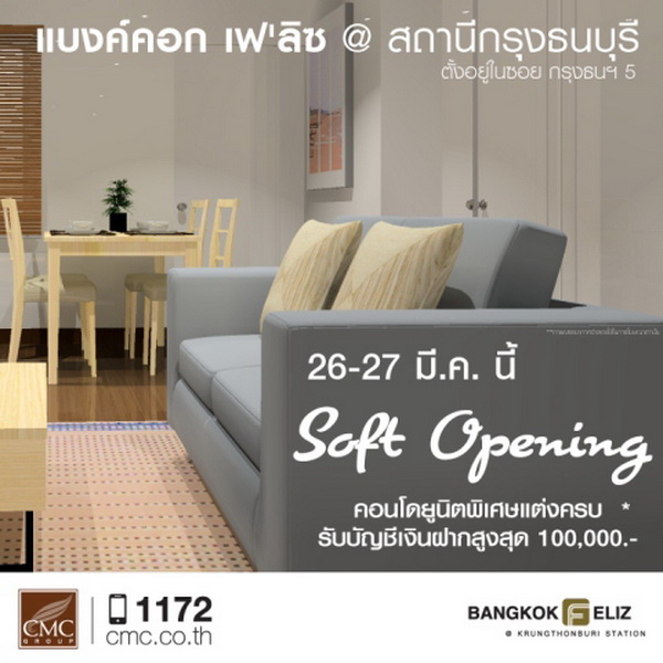 บริษัท เจ้าพระยามหานคร จำกัด (มหาชน) หรือ CMC Group ขอส่งมอบข้อเสนอสุดพิเศษ ในงาน Soft Openingกับโครงการ แบงค์คอก เฟลิซ @ สถานีกรุงธนบุรีคอนโดยูนิตพิเศษตกแต่งครบ โดดเด่นด้วยดีไซน์ ที่เป็นส่วนตัว ฟังก์ชั่นที่ทันสมัย และตอบสนองความต้องการสิ่งใหม่ๆ ในชีวิตคุณ ตั้งบนทำเลศักยภาพที่ดีที่สุด พร้อมเชื่อมต่อย่านธุรกิจสำคัญต่างๆ จากสถานีรถไฟฟ้า BTS สถานีกรุงธุนบุรีเพียง 150 เมตรเท่านั้น วันที่ 26-27 มีนาคมนี้ พบโปรโมชั่นและข้อเสนอสุดพิเศษ "รับบัญชีเงินฝากสูงสุด 100,000บาท" ในงาน Soft Opening@ Sales Gallery