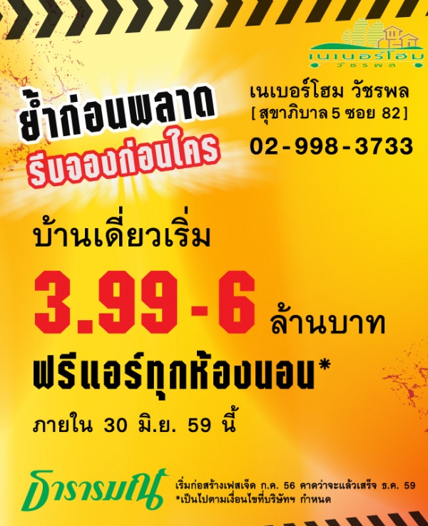 บริษัท ธารารมณ์ เอ็นเตอร์ไพรส์ จำกัด (มหาชน) เปิดเผยถึงโปรโมชั่นใหม่ปลายซัมเมอร์ "Hot Sales ย้ำก่อนพลาด รีบจองก่อนใคร" โดยจัดราคาพิเศษมอบสำหรับผู้ที่ต้องการบ้านเดี่ยวพร้อมโอนใน โครงการเนเบอร์โฮม วัชรพล ถนนสุขาภิบาล 5 ซอย 82 ด้วยราคาสุทธิเริ่มเพียง 3.99 6.0 ล้านบาท