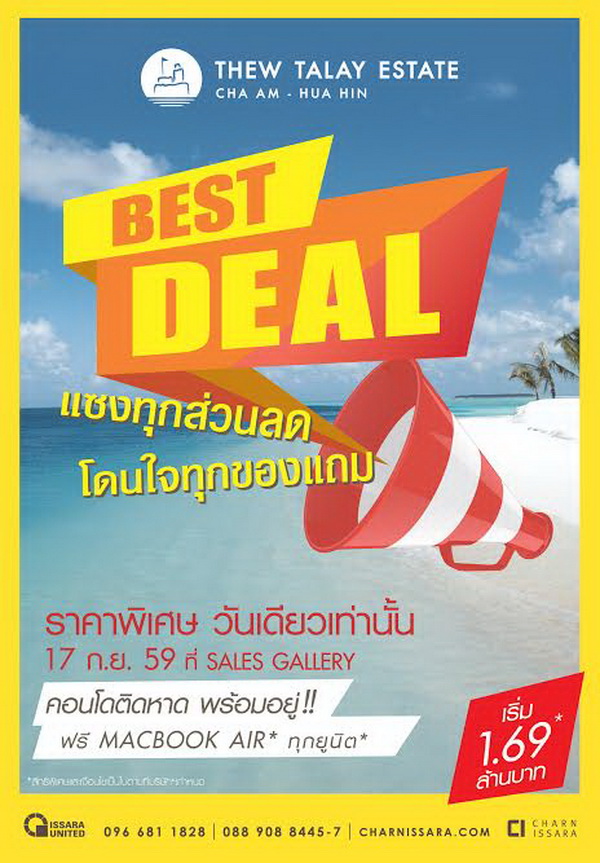 นอกจากนี้ยังมีข้อเสนออื่นๆ ที่น่าสนใจอีกมากมาย สำหรับโปรโมชั่น “BEST DEAL” จะจัดขึ้นเพียง 1 วันเท่านั้น คือวันเสาร์ที่ 17 กันยายน 2559 ณ Sales Gallery โครงการ ทิวทะเล เอสเตท ชะอำ-หัวหิน ถ.เพชรเกษม ชะอำ จ.เพชรบุรี