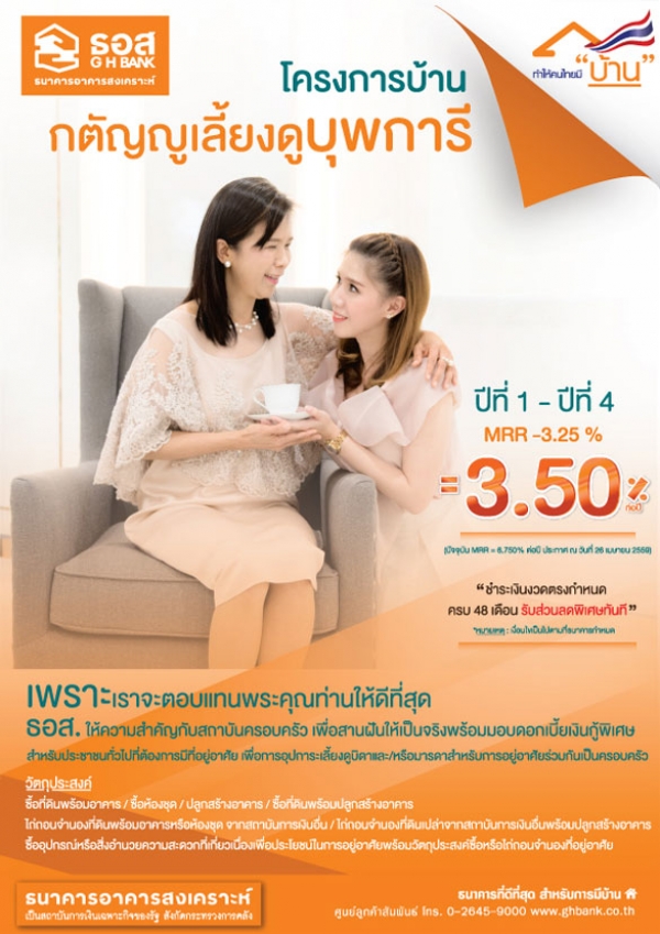 ธนาคารอาคารสงเคราะห์ เตรียมวงเงิน 20,000 ล้านบาท จัดทำ “โครงการสินเชื่อบ้านกตัญญูเลี้ยงดูบุพการี” อัตราดอกเบี้ยปีที่ 1 – 4 เท่ากับ MRR–3.25% ต่อปี (หรือ 3.50% ต่อปี) คิดจาก MRR ธอส.ปัจจุบันเท่ากับ 6.75% ต่อปี ให้กู้สำหรับลูกกตัญญูที่มีบิดาหรือมารดาอยู่อาศัยร่วมด้วย พิเศษ!! ผ่อนชำระเงินงวดดีสม่ำเสมอ 48 เดือน รับส่วนลดอัตราดอกเบี้ยเงินกู้พิเศษ 1% ของวงเงินกู้เพื่อนำไปตัดชำระเงินต้นทันที