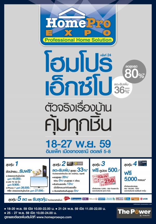 "โฮมโปร" ผู้นำธุรกิจศูนย์รวมวัสดุและอุปกรณ์ตกแต่งบ้านครบวงจร จัดมหกรรมตัวจริงเรื่องบ้านคุ้มทุกชิ้น แบบครบวงจรที่สุด ที่คุณพลาดไม่ได้ HomePro Expo ครั้งที่ 24" ลดสูงสุดกว่า 80 %" ตั้งแต่วันที่ 18-27 พ.ย. 2559 ณ ฮอลล์ 5-8 อิมแพ็ค เมืองทองธานี ขนขบวนสินค้าเพื่อบ้านจากผู้ผลิตชั้นนำกว่า 300 บริษัท มาลดกระหน่ำสูงสุด 80% ให้ช้อปจุใจ 10 วัน พร้อมรับของสมนาคุณสุดคุ้ม และรับสิทธิพิเศษอีกมากมายจากสถาบันการเงิน บัตรเครดิตชั้นนำที่ร่วมอีกทั้งยังได้ลุ้นรับของกำนัลสุดพิเศษที่ "โฮมโปร" จัดมาให้คุ้มแบบถึงใจ งานนี้คนรักบ้านห้ามพลาด !!