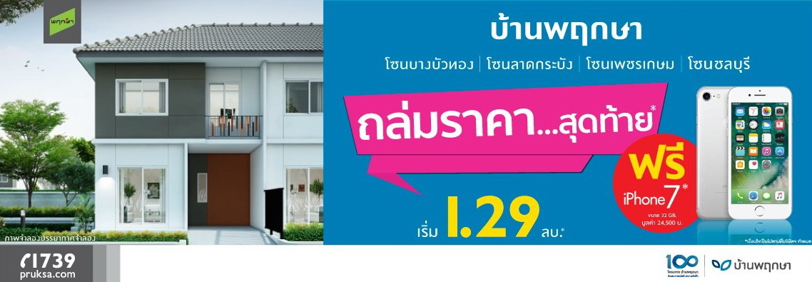 บริษัท พฤกษา เรียลเอสเตท จำกัด(มหาชน) จัดโปรโมชั่น ถล่มราคา สุดท้ายที่บ้านพฤกษาทั้ง 4 โซน ฟรี ทุกค่าใช้จ่ายวันโอน* ที่บ้านพฤกษา กว่า 20 ทำเล ฟรี iphone 7* ขนาด 32 GB มูลค่า 24,500 บาท