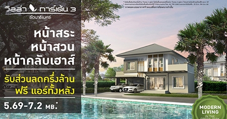 รสิกา เตรียมจัดโปรแรงสุดคุ้มในทำเลพิเศษ "หน้าสระ หน้าสวน หน้าคลับเฮาส์" รับส่วนลดครึ่งล้าน พร้อมฟรีแอร์ทั้งหลัง 23 พฤษภาคม - 30 มิถุนายน 2560 กับโครงการ วิลล่า การ์เด้น 3 รัตนาธิเบศร์ บ้านเดี่ยวพร้อมอยู่สไตล์โมเดิร์น ภายใต้แนวคิด "Modern in Living The Green Park" ราคาเริ่มต้น 5.69 - 7.2 ล้านบาท*
