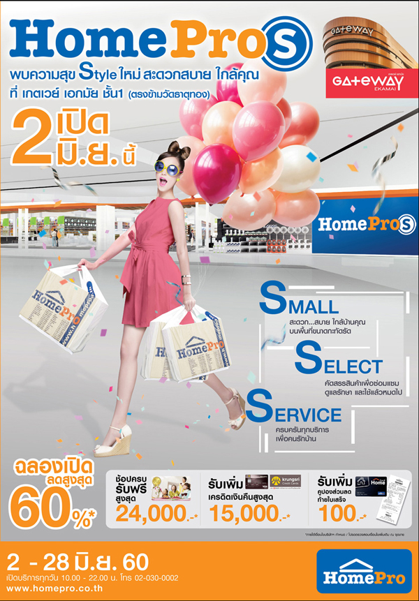 โฮมโปร แตกไลน์สโตร์รูปแบบใหม่ “HomePro S” Small Service Select สโตร์ขนาดเล็ก แต่ครบด้วยคุณภาพทั้งสินค้า และบริการ เอาใจคนเมืองโดยเฉพาะ คาดช่วยกระตุ้นรายได้เพิ่มขึ้น ประเดิมสาขาแรกใจกลางเมืองเกตเวย์ เอกมัย พร้อมโปรโมชั่นฉลองเปิดลดสูงสุดกว่า 60%