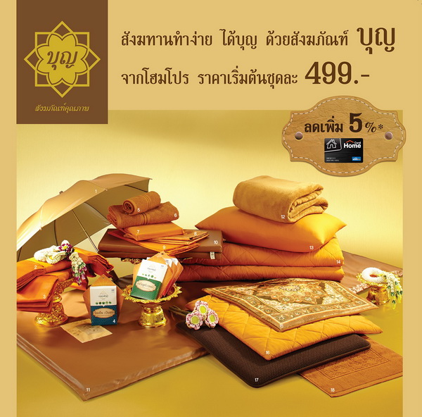ในช่วงเทศกาลเข้าพรรษานี้ "โฮมโปร" ชวนคุณ อิ่มใจ ได้บุญ ด้วยชุดสังฆภัณฑ์ "บุญ" จากโฮมโปร ที่มีให้เลือกมากมายหลากหลายชุด ผ่านการคัดสรรแล้วทุกชิ้นว่าเป็นสิ่งของเครื่องใช้ที่ถูกต้องตามบทบัญญัติ ด้านพระธรรมวินัย พระภิกษุสามารถนำไปใช้งานได้อย่างเกิดประโยชน์สูงสุดในกิจของสงฆ์ หาซื้อได้ทุกวัน ในราคาย่อมเยาว์