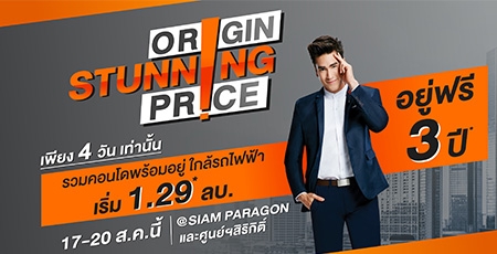 บริษัท ออริจิ้น พร็อพเพอร์ตี้ จำกัด (มหาชน) ขนคอนโดพร้อมอยู่ใกล้รถไฟฟ้า ร่วมจัดโปรโมชั่น "Origin Stunning Price" ราคาเริ่มต้น 1.29 ล้านบาท อยู่ฟรี 3 ปี* วันที่ 17 - 20 สิงหาคม นี้ เพียง 4 วันเท่านั้น พบกันที่ Siam Paragon และศูนย์ประชุมแห่งชาติสิริกิติ์
