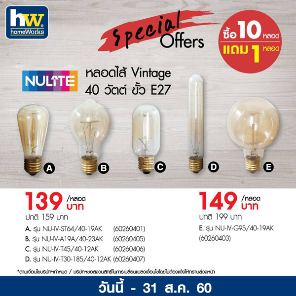 โฮมเวิร์ค จัดโปรโมชั่นที่มันช่างจ้าซะเหลือเกิน กับโปรโมชั่นสุดพิเศษ ซื้อ 10 แถม 1 หลอดไฟ NULITE หลอดไฟวินเทจ 40 วัตต์ ขั้ว E27 สว่างสไวกันทั้งบ้านได้แล้ว ตั้งแต่วันนี้ - 31 สิงหาคม 2560 ที่ โฮมเวิร์ค ทุกสาขา